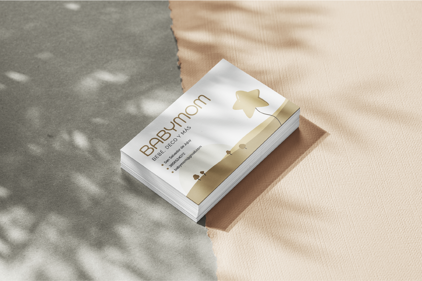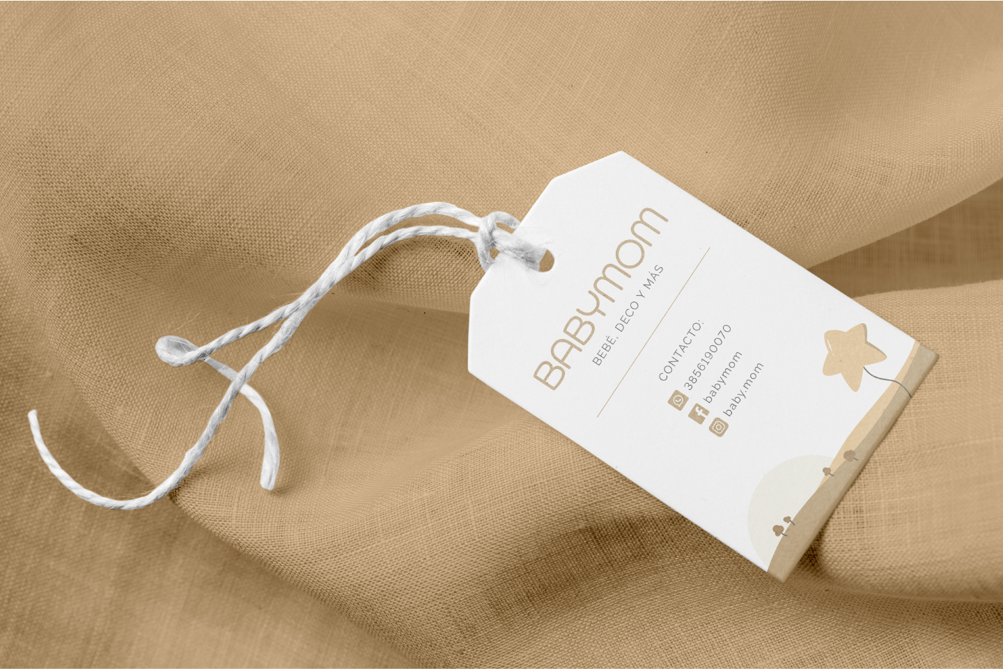 Babymom es un negocio que ofrece artículos para bebés y niños. Para ello, creé un logo y algunas aplicaciones como tarjetas, etiquetas y bolsas.